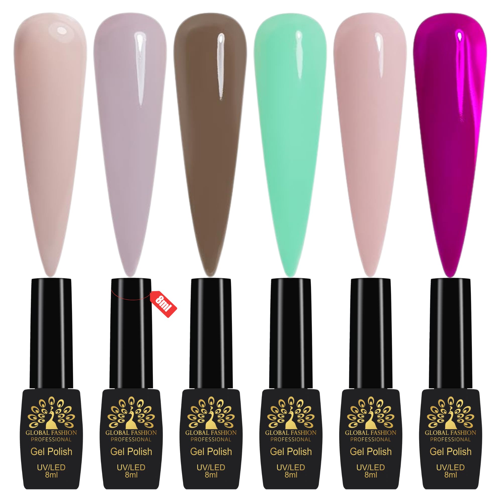 Global Fashion Gel Nail Polish Set – 6 Colors × 8ml, Black Elite UV/LED Soak-Off Gel, Long-Lasting, Chip-Resistant, Vegan Formula, High-Shine Finish for Salon & DIY Nail Art