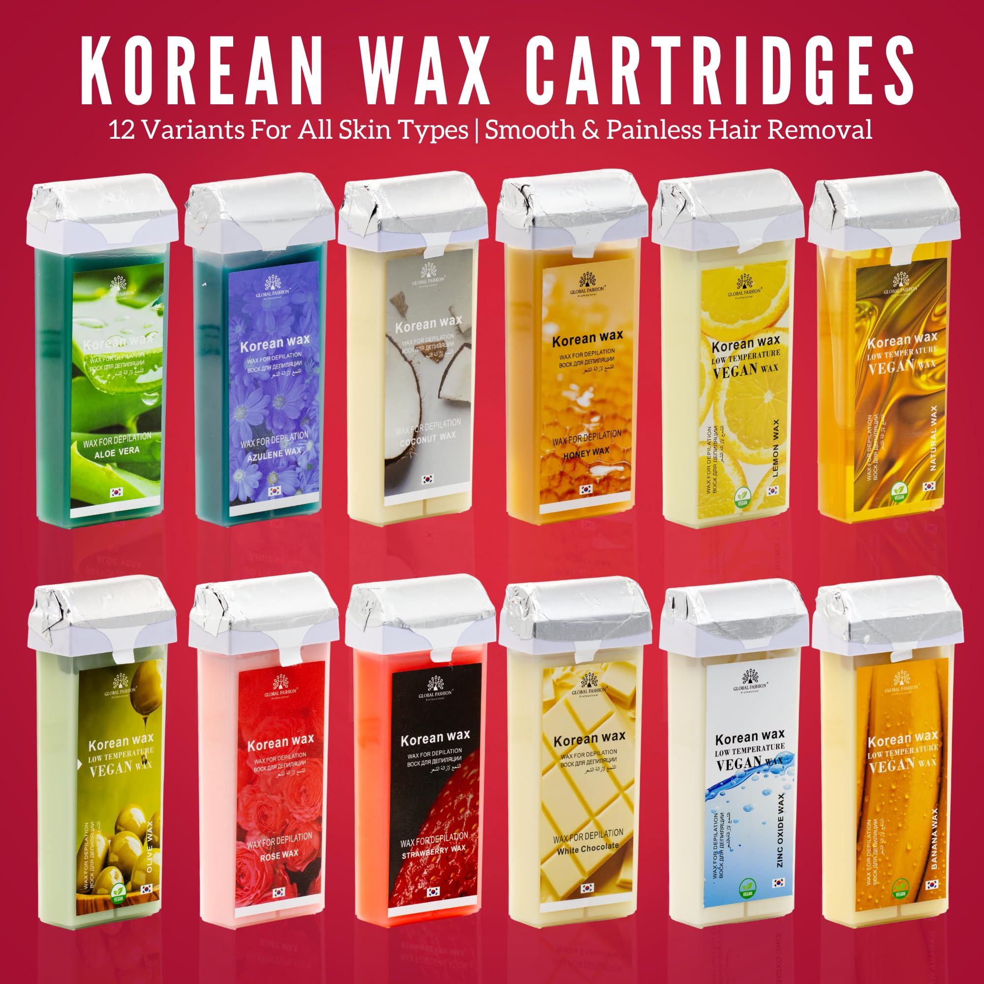 Global Fashion Roll-On Wax Cartridge 400ml – Strawberry, Korean Depilatory Wax Refill for Smooth Hair Removal, Soft Wax Roller for Legs, Arms & Body